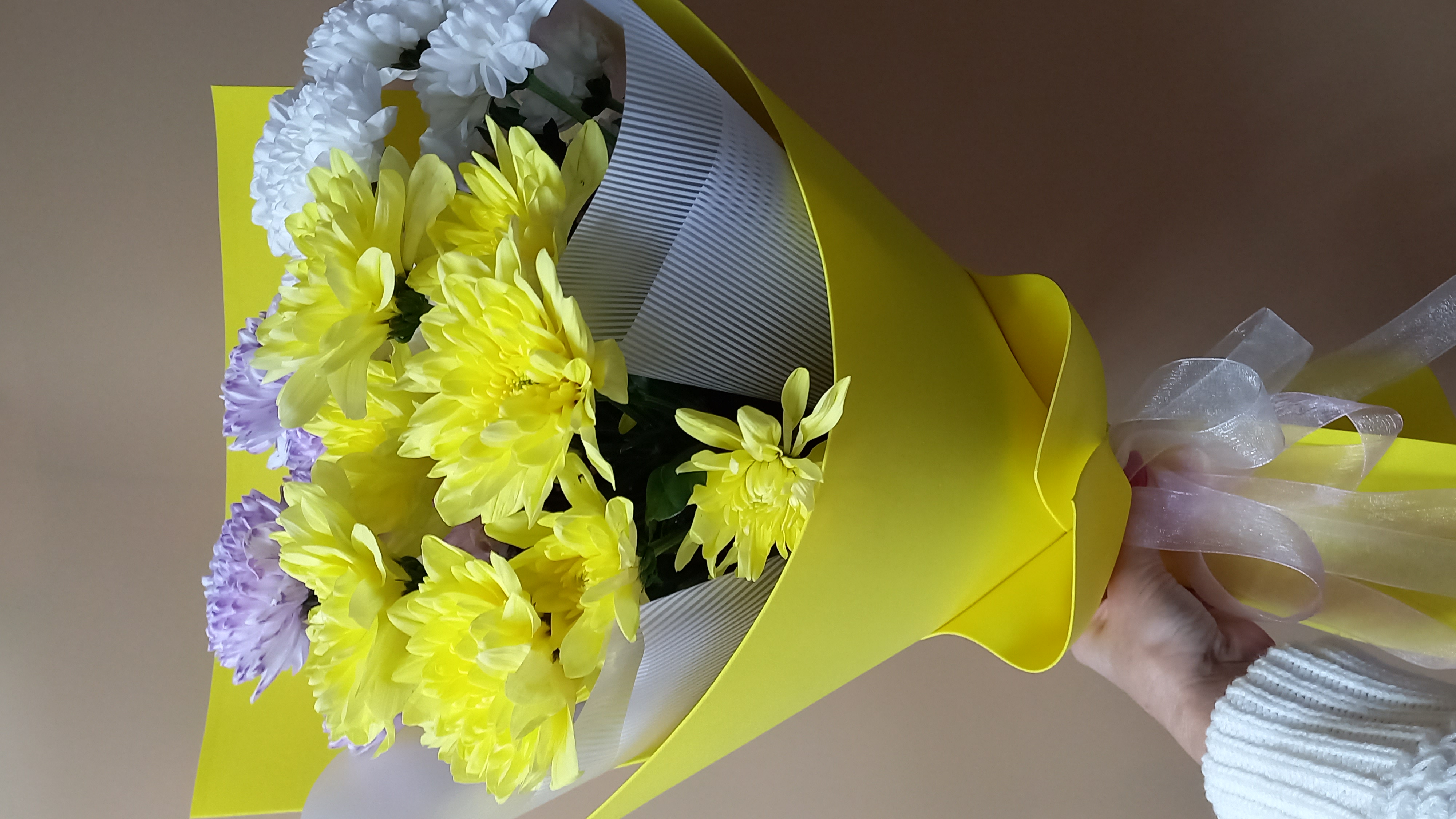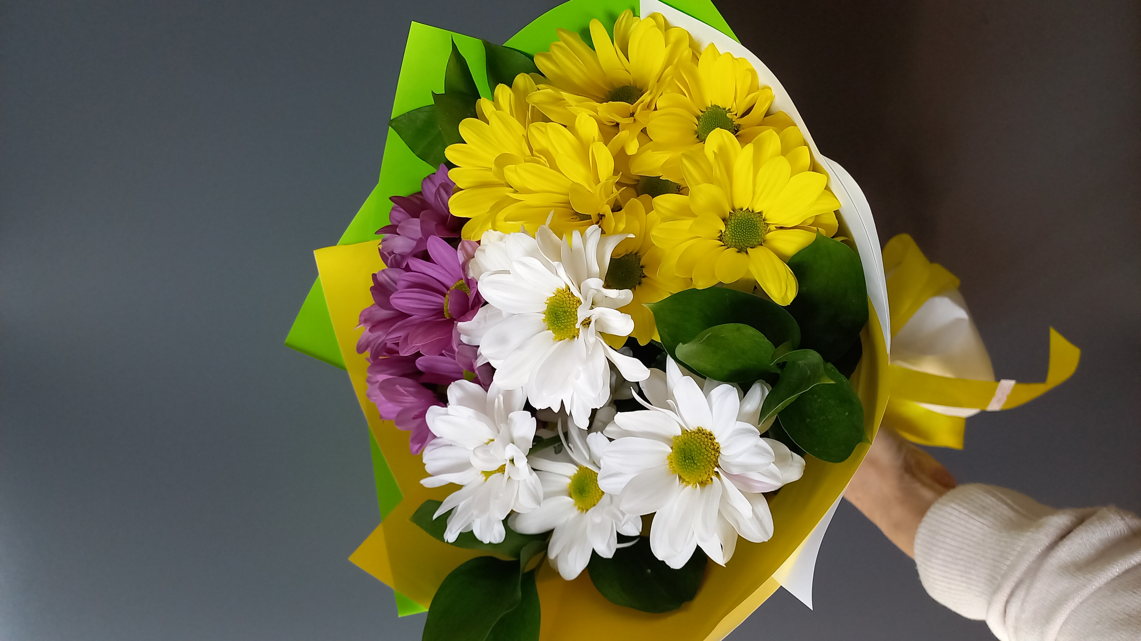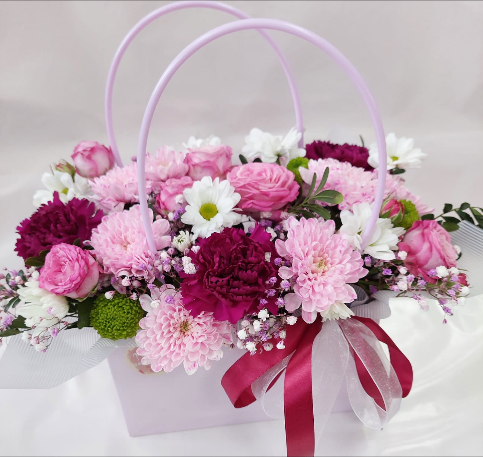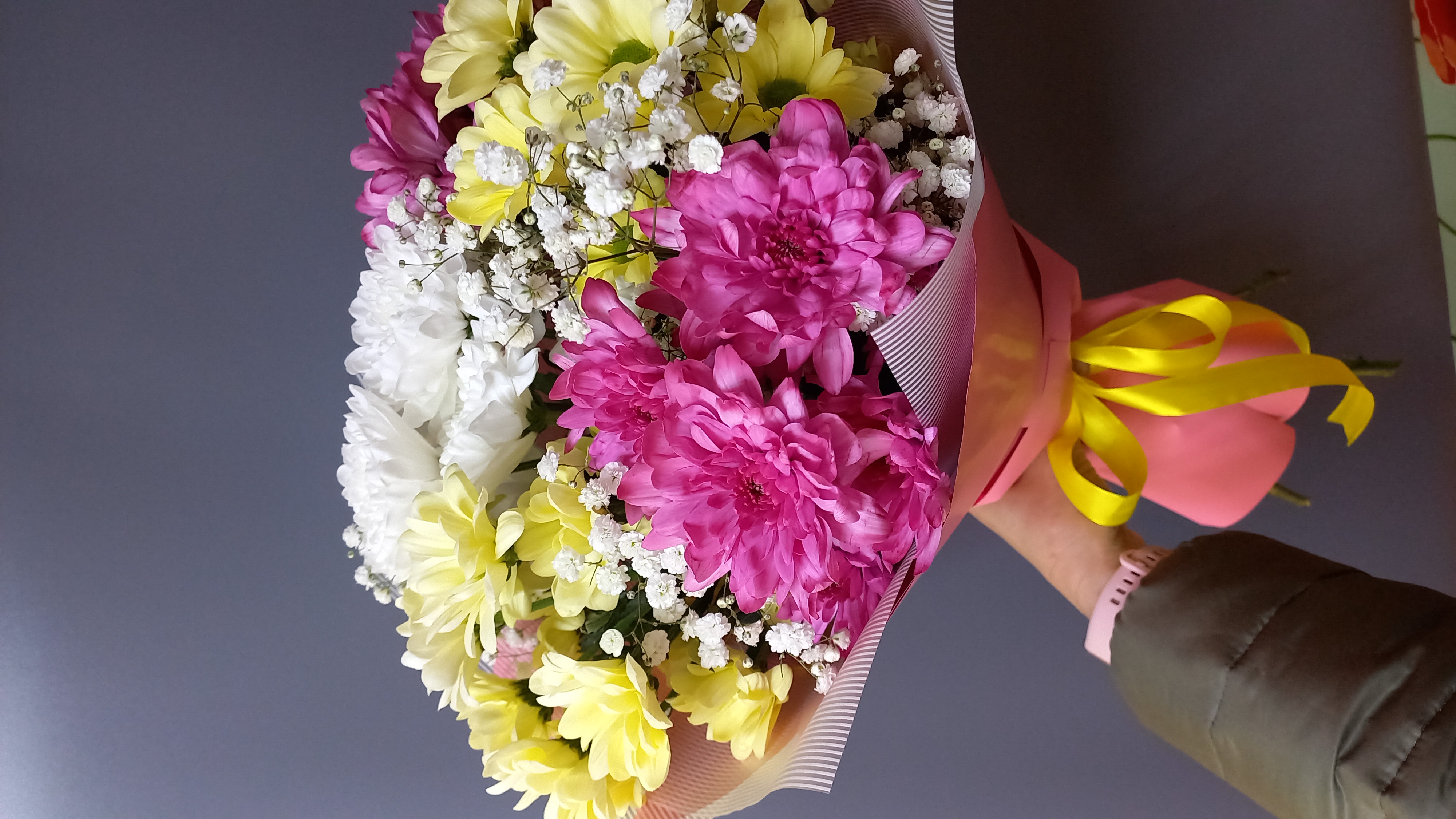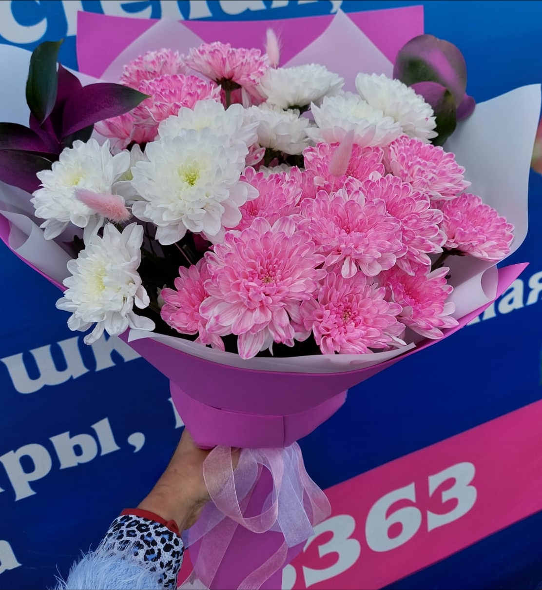 Диантус 3шт, хризантема кустовая 1шт, альстромерия 1шт,роза кустовая 1шт, рускус 2шт, сухоцветы 3шт, упаковка.