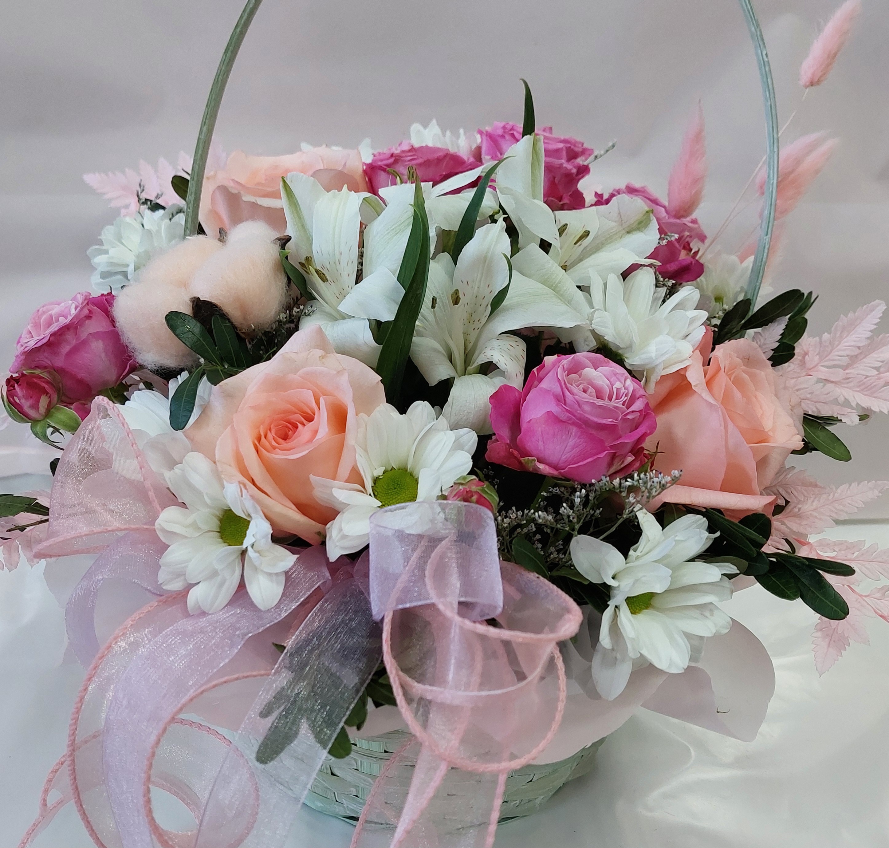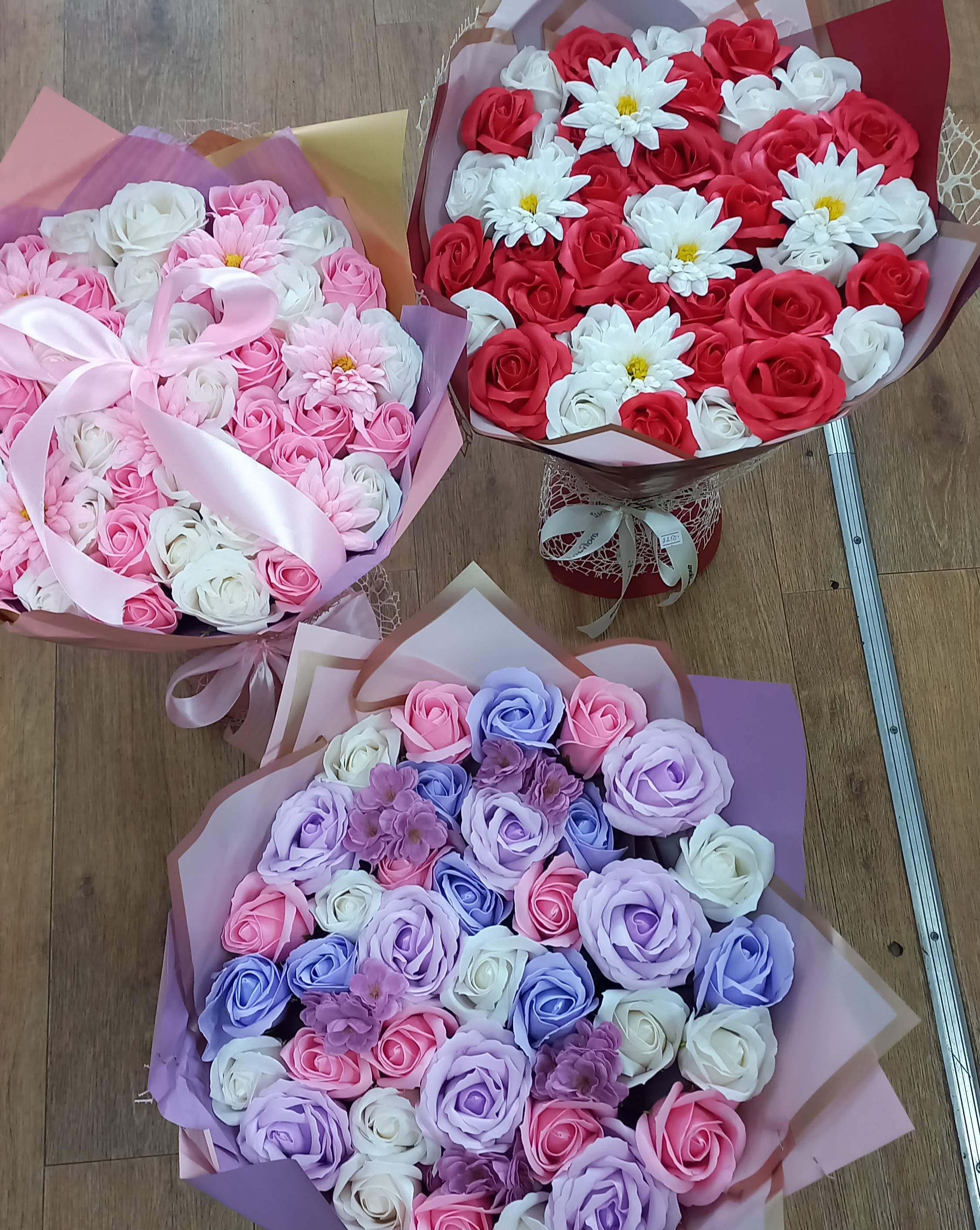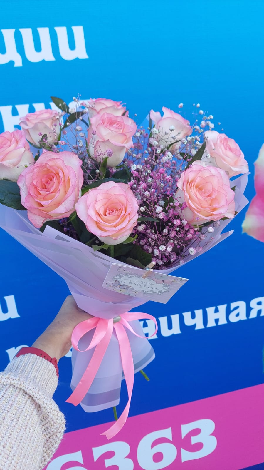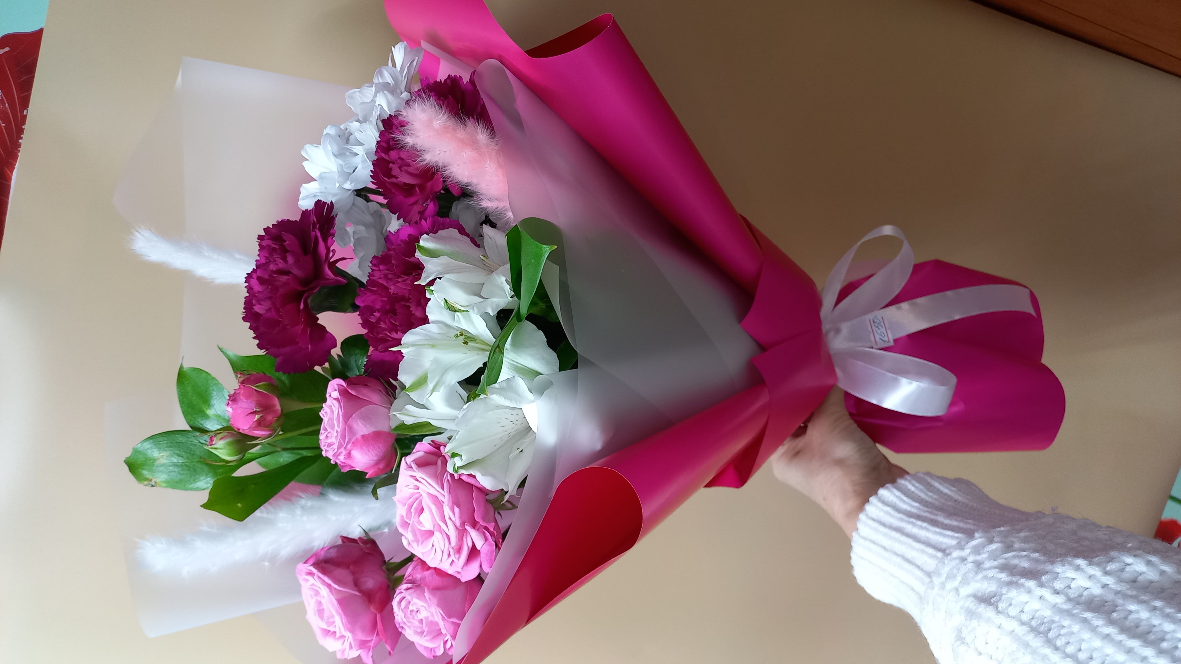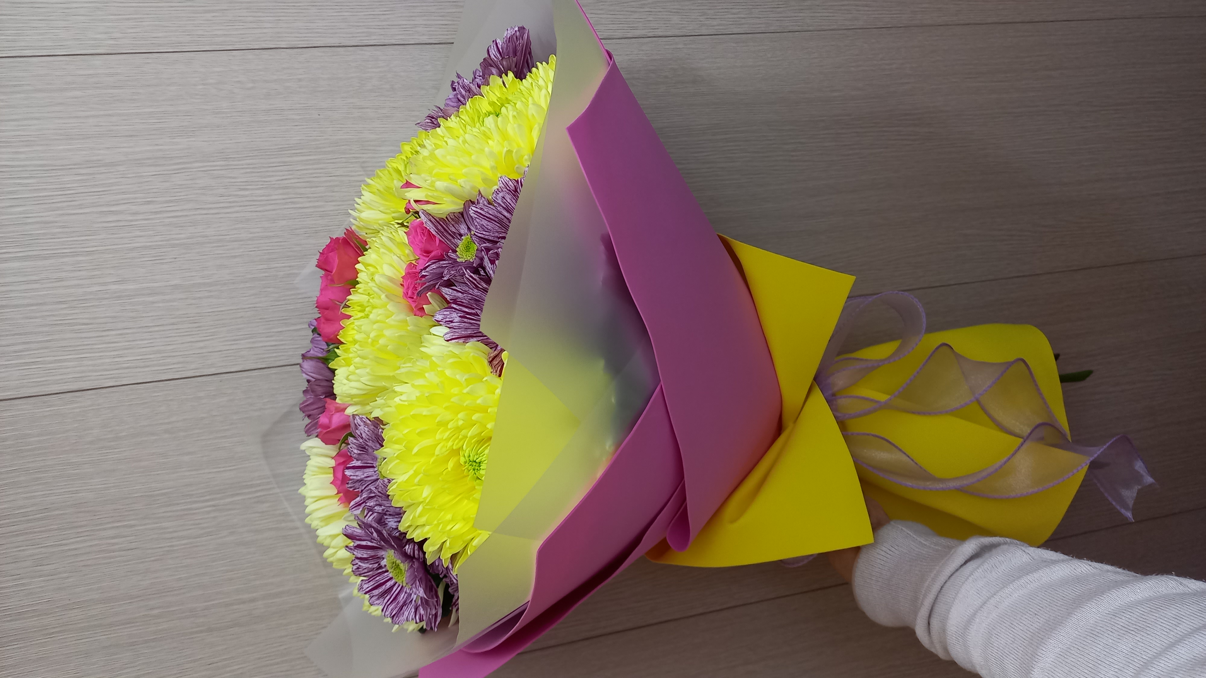Диантус 3шт, хризантема кустовая 1шт, альстромерия 1шт,роза кустовая 1шт, рускус 2шт, сухоцветы 3шт, упаковка.