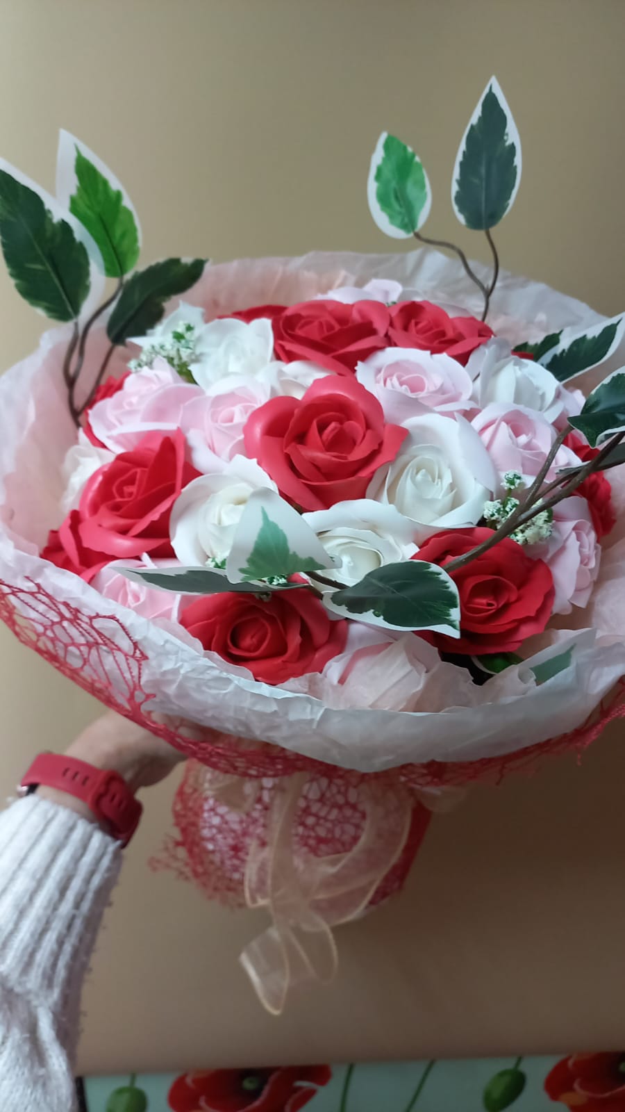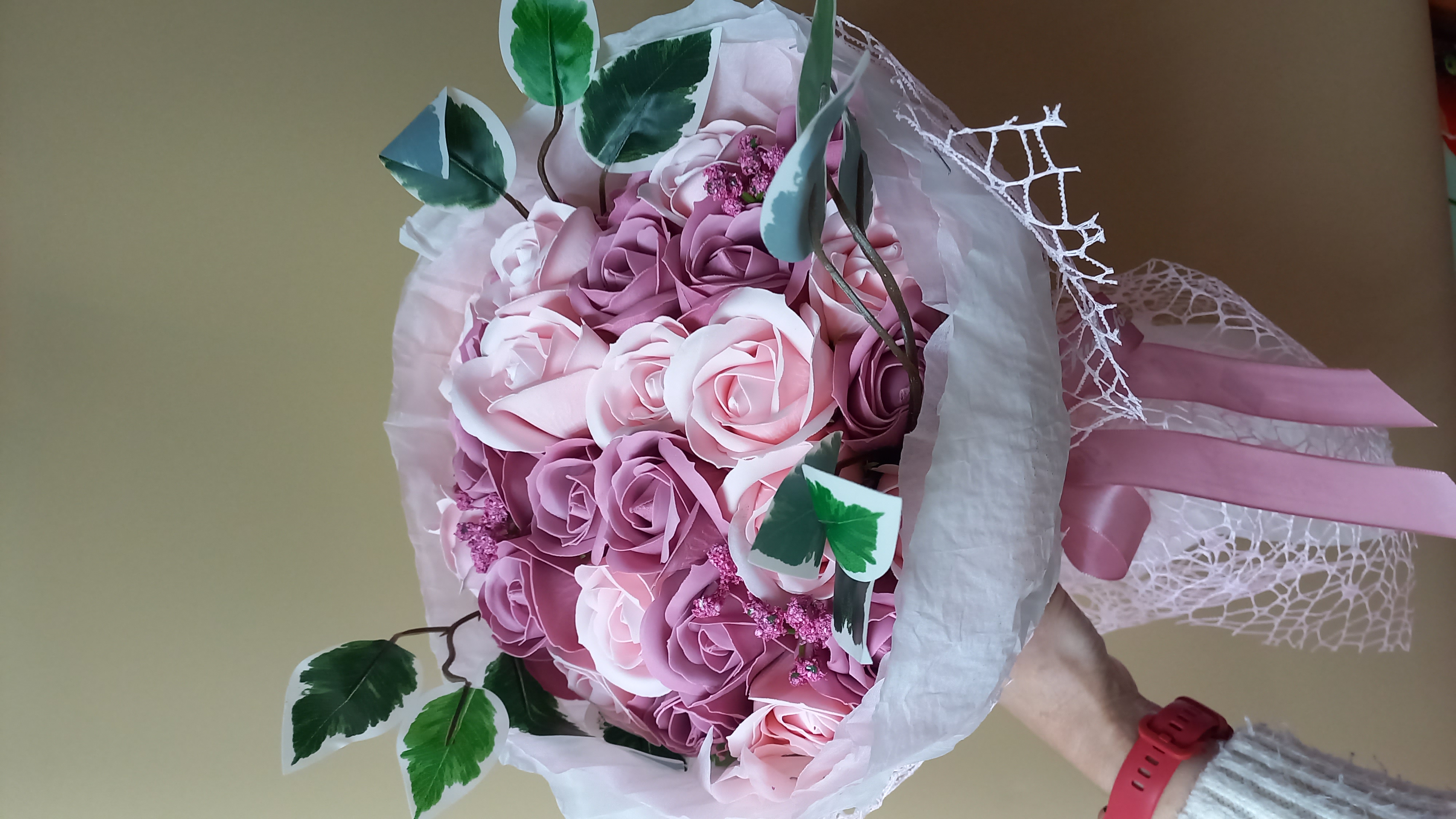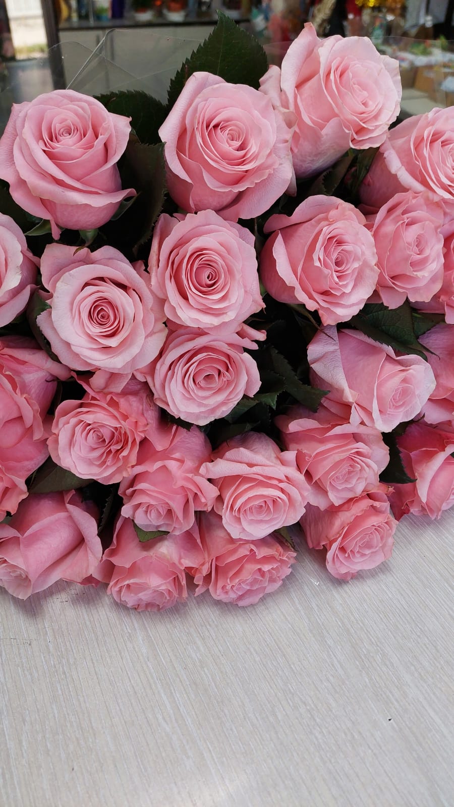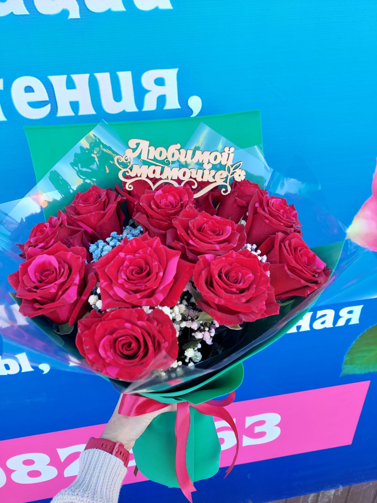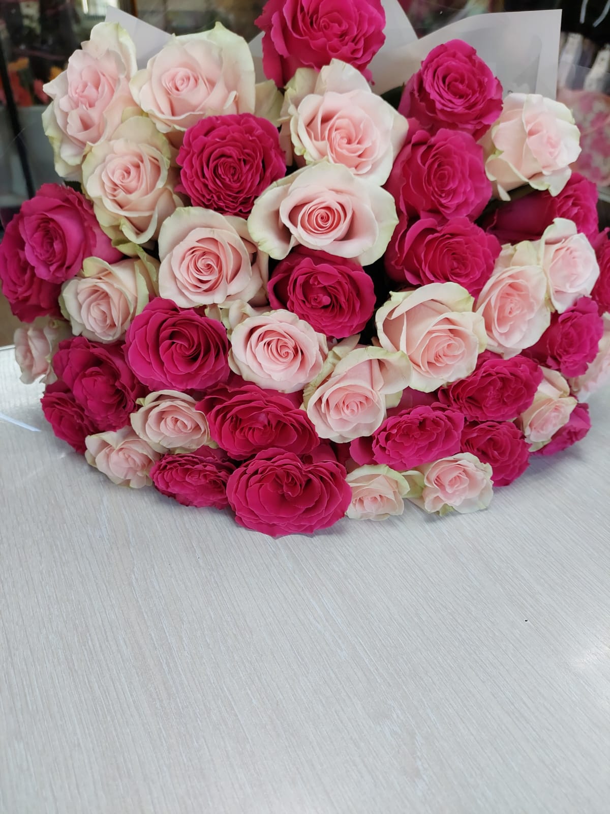 Роза Амстердам , кустовая роза, альстромерия, хризантема кустовая писташ, папоротник, декор.
